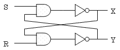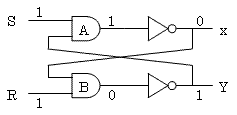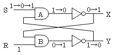 初期状態は、S = 1、R = 1、X = 0、Y = 1なので図のような状態である。