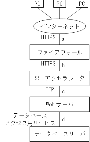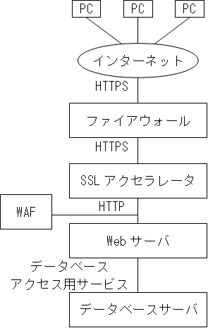 図のような構成と通信サービスのシステムにおいて、Webアプリケーションの脆(ぜい)弱性対策のためのWAFの設置場所として最も適切な箇所はどこか。 ここで、WAFには通信を暗号化したり、復号したりする機能はないものとする。
