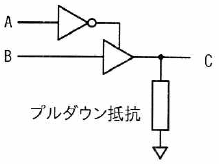 スリーステートバッファは上からの入力(制御信号)が真だと左からの入力信号が出力信号にその出力され、偽の場合には左からの入力信号にかかわらず出力はハイインピーダンスになります。スリーステートバッファの出力がハイインピーダンスになると回路図の出力側にあるプルダウン抵抗により回路の出力信号Cは偽になります。