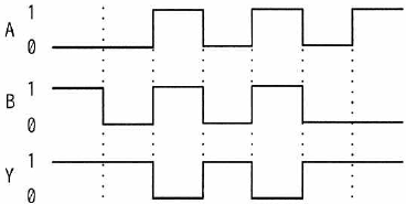 入力がAとB、出力がYの論理回路を動作させたとき、図のタイムチャートが得られた。 この論理回路として、適切なものはどれか。