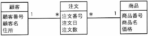 データモデルから“注文”から見て“商品”の多重度は1なので、“123456:注文”が複数の商品にリンクしているのは、誤りである。(×) |