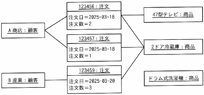 データモデルから“顧客”から見て“商品”の多重度は0以上(*)なので、“A商店:顧客”が複数の注文にリンクしているのは、正しい。(〇) |