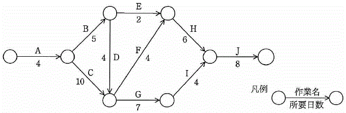 当初の計画のクリティカルパスを探すと、A(4)→C(10)→G(7)→I(4)→J(8)で、総所要日数は33日である。