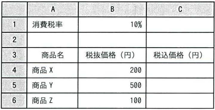 問題の表では消費税率が入っているセルB1を参照する場合は、常にこのセルを参照するように絶対参照にする必要がある。
