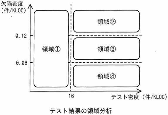 これを品質管理基準に照らすとテスト密度は基準値(20件/KLOCの80%以上)を満たしているが、欠陥密度は基準値(0.1件/KLOCの80%以上120%未満)を満たしていない。