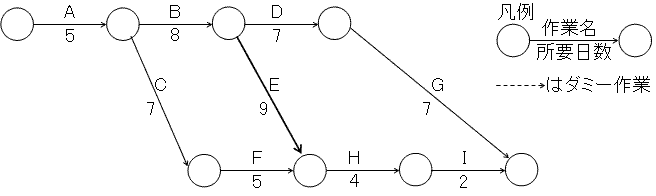 図1のクリティカルパスを求めると、A→B→E→H→Iで、完了までに必要な日数は28日である。