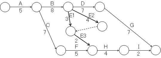 作業Eを図2のようにE1、E2、E3のように分けると、作業EはE2→E3の6日になるので、作業Eは9日から6日に3日短縮できるが、図2全体のクリティカルパスを求めるとA→B→D→Gの27日になっているので、短縮できる日数は1日(ア)である。