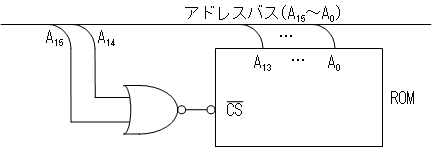 このROMにアクセスするにはチップセレクト信号(CS)をLow(0)にする必要があるので、A15とA14の信号はNOR回路でチップセレクト信号に接続しているので、A15とA14のどちらか一方が1である必要がある。