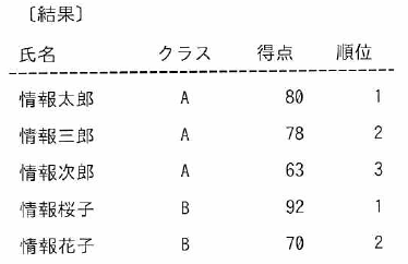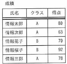 “成績”表から、クラスごとに得点の高い順に個人を順位付けした結果を求めるSQL文の、aに入れる字句はどれか。