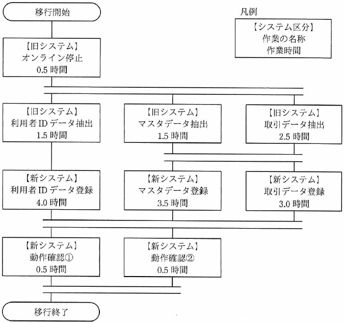 図は、あるプロジェクトにおける、旧システムから新イステムへの切替え移行作業の流れ図である。 次の条件で作業を遂行する場合、移行開始から移行終了までの所要時間は最短で何時間が。