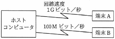 図のネットワーク構成のシステムにおいて、同じメッセージ調のデータをホストコンピュータとの間で送受信した場合のターンアラウンドタイムは、端末Aでは100ミリ秒、端末Bでは820ミリ秒であった。 上り、下りのメッセージ調は同じ長さで、ホストコンピュータの処理時間は端末A、Bのどちらから利用しても同じとするとき、端末Aからホストコンピュータへの片道の伝送時間は何ミリ秒か。 ここで、ターンアラウンドタイムは、端末がデータを回線に送信し始めてから応答データを受信し終わるまでの時間とし、伝送時間は回線速度だけに依存するものとする。