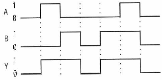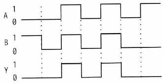 図はスイッチA及びBの状態によって、LEDが点灯又は消灯する回路である。 スイッチAが「オンの状態をA = 1、オフの状態をA = 0とし、スイッチBも同様にオンの状態をB = 1、オフの状態をB = 0とする。 また、LEDが点灯する状態をY = 1、消灯する状態をY = 0とする。 このとき、図の回路を動作させたときのタイミングチャートとして、適切なものはどれか。