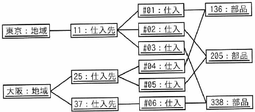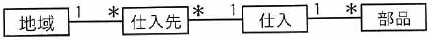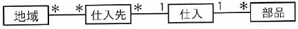 【解説】 “地域”と“仕入先”に着目すると、1つの地域に複数の仕入れ先があり、仕入先は1つの地域にしかないので、その関係は になる。同様に“仕入先”と“仕入”は であり、“仕入”と“部品”は なので、これらをまとめると (イ)になる。