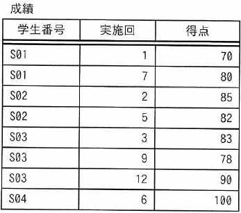 SELECT R1.学生番号, R1.実施回, R1.得点 FROM 成績 R1