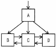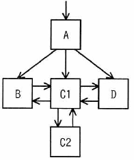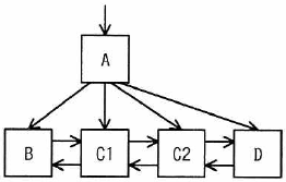 関係データベースのテーブルにレコードを1件追加したところ、インデックスとして使う、B+木のリーフノードCがノードC1とC2に分割された。 ノード分割後のB+木構造はどれか。 ここで、矢印はノードへのポインタとする。 また、中間ノードAには十分な空きがあるものとする。