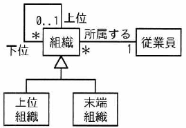 階層構造をもつ組織と社員の所属を表すUMLのクラス図のうち、“社員は組織階層中のどの組織にも所属できるが、兼務はしない”とするものはどれか。