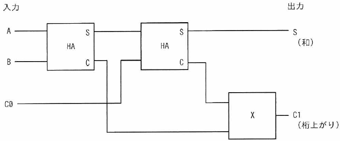HA@は A + B の計算をしていて、HAAはHA@にC0を加えている。桁上がりのCはHA@かHAAのどちらで桁上がりがあれば、それをC1として出力する必要があるので、Xの論理はOR(エ)になる。