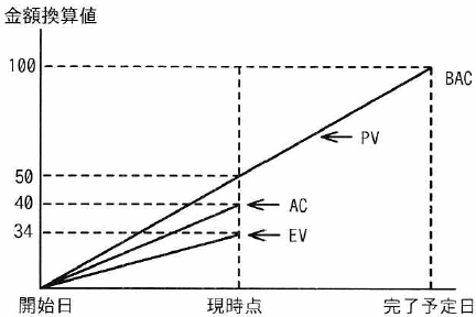 図は、プロジェクトの開始日から完了予定日までの期間の半分が経過して時点の状況である。