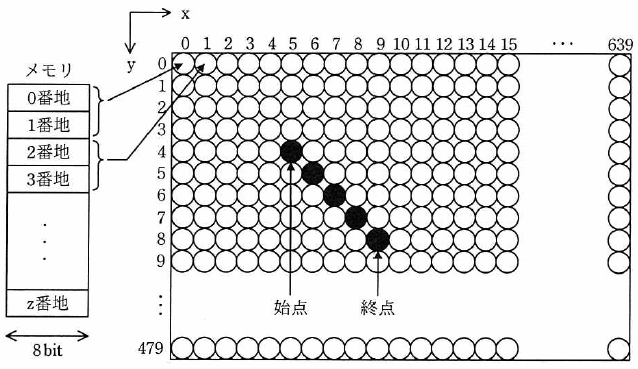 次の方式で画素にメモリを割当てる640×480のグラフィックLCDモジュールがある。 座標(x, y)で始点(5, 4)から終点(9, 8)まで直線を描画するとき、直線状のx=7の画素に割当てられるメモリのアドレスの先頭は何番地か。