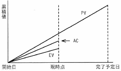 EVMで管理しているプロジェクトがある。 図は、プロジェクトの開始から完了予定までの期間の半分が経過して時点の状況である。 コスト効率、スケジュール効率がこのままで推移すると仮定した場合の見通しのうち、適切なものはどれか。