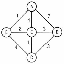 5個のノードA〜Eから構成される図のネットワークにおいて、Aをルートノードとするスパニングツリーを構築した。 このとき、スパニングツリー上で隣接するノードはどれか。 ここで、図中の数値は対応する区間のコストを表すものとする。