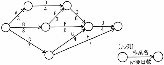 作業Dを2日、作業Jを1日短縮したときのクリティカルパスを調べるとB(3)、E(3)、I(6)、J(3)になり、所要日数は15日になり、作業Fを通る経路はB(3)、F(6)、J(3)で所要日数は12日なので、作業Fの総余裕日数3日になる。