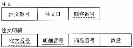 図のような関係データベースの“注文”表と“注文明細”表がある。 “注文”表の行を削除すると、対応する“注文明細”表の行が、自動的に削除されるようにしたい。 参照制約定義の削除規則(ON DELETE)に指定する語句はどれか。 ここで、図中の実線の下線は主キーを、破線の下線は外部キーを表す。