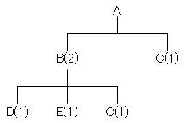 図は、製品Aの構成部品を示し、括弧内の数字は上位部品1個当たりの所要数量である。 この製品Aを10個生産する場合、部品Cは、少なくとも何個発注する必要があるか。 ここで、現在の部品Bの在庫は0個、部品Cの在庫は5個である。